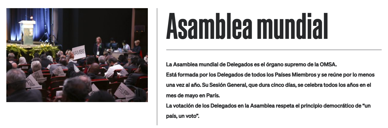 La Asamblea mundial de Delegados es el órgano supremo de la OMSA. Está formada por los Delegados de todos los Países Miembros y se reúne por lo menos una vez